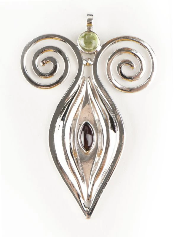 Die kreative Energie der Muttergöttin ist in diesem wunderschön gearbeiteten Anhänger aus Silber dargestellt in der Samenform des Granats. Diese Form hat ausserdem einen Bezug zur Yoni, der heiligen weiblichen Energie. Die zwei Spiralen symbolisieren das Entfalten und die Evolution des Universums. Ein runder Peridot in der Farbe des Herzchakras erinnert an das Grün der Natur und weist auf die bedingungslose, weiträumige Liebe der Muttergöttin hin.