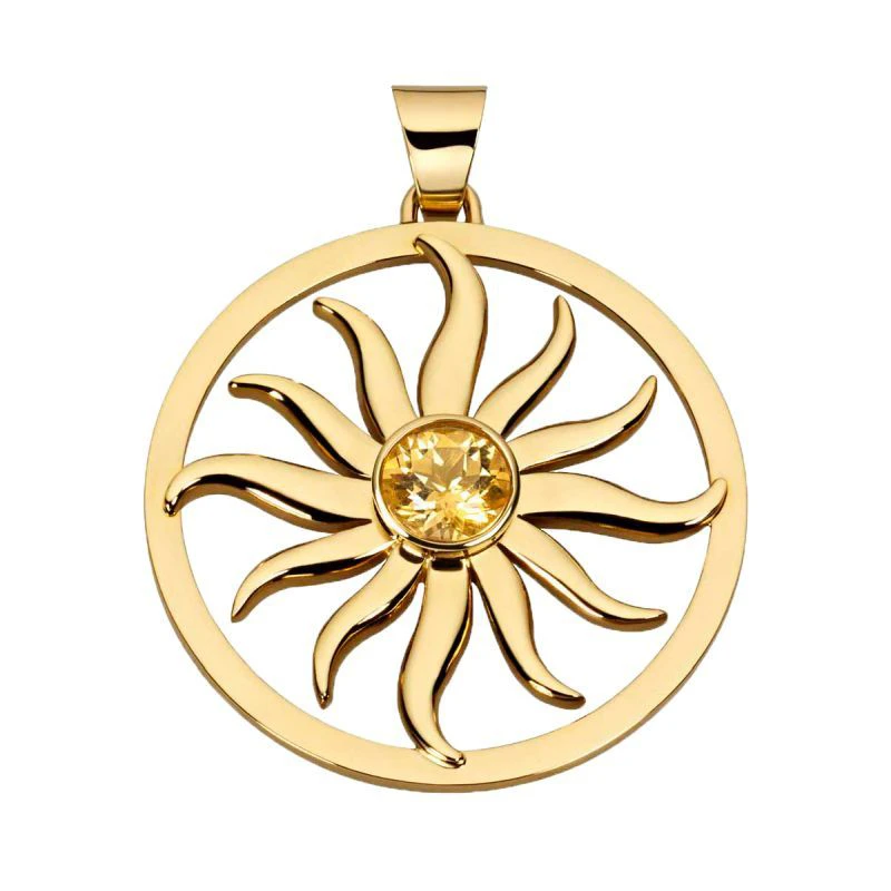 Die 12 Speichen des Sonnenrades rotieren gegen den Uhrzeigersinn; der hochwertige, geschliffene Citrin steht für das in sich ruhende Zentrum – das Selbst. Die Sonne symbolisiert Bewegung, Kraft und strahlende Lebendigkeit. Durch die 12 Strahlen wird zugleich eine Beziehung zu den 12 Tierkreiszeichen hergestellt, die in ihrer Gesamtheit die geistige Evolution des Menschen beschreiben. Dieses Schmuckstück verbindet uns mit dem inneren Kern, dem strahlenden Licht der Seele. Die Lieferung erfolgt in einer Inner-Light-Schmuckverpackung und mit Beschreibung der Symbolik.