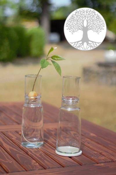 Anzuchtglas mit dem Motiv "Lebensbaum" im Boden.