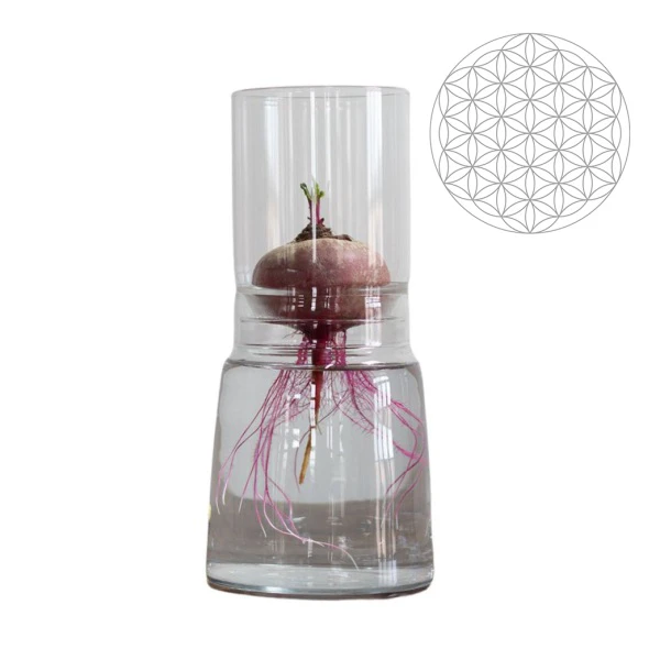 Viele kennen es noch von früher - das Hyazinthenglas (meistens aus Kunststoff). Das Glas war unser Ideengeber. Nach unseren Erfahrungen ist es allerdings unbedingt notwendig, das Glas teilbar zu machen, damit ein Nachgiessen oder Wasserwechsel einfach händelbar ist. Der untere Teil des Anzuchtglas ist nach dem goldenen Schnitt gefertigt.