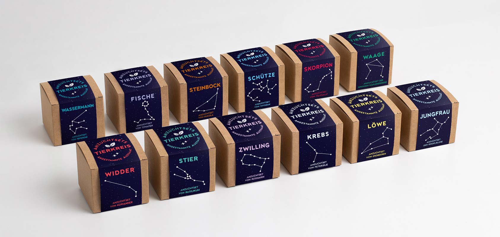 Sorten: Widder (Koriander), Stier (Basilikum), Zwilling (Rosmarin), Krebs (Petersilie), Löwe (Erdbeeren), Jungfrau (Ringelblumen), Waage (Kapuzinerkresse), Skorpion (Feldsalat), Schütze (Thymian), Steinbock (Rucola), Wassermann (Peperoni), Fische (Tomaten).