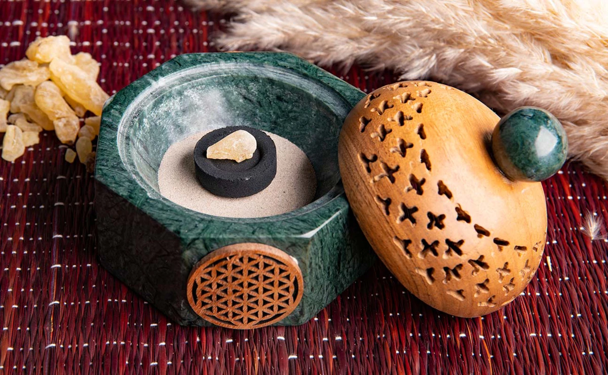 Fürstliches Räuchergefäss aus schwerem, grünem Marmor. An zwei Seiten mit der Blume des Lebens und einem Kuppeldeckel aus Holz mit vielen kleinen, sternförmigen Öffnungen, durch die die Rauchschwaden aufsteigen können. Die hohe Qualität ermöglicht ein Räuchern ohne Sand. Es steht schonend auf 4 Gummifüssen.