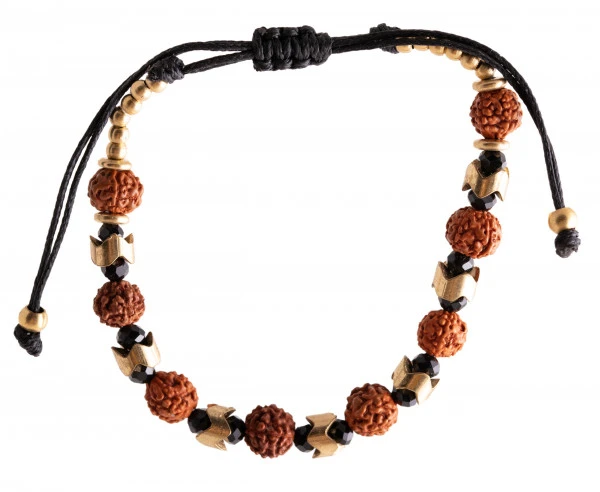 Rudraksha Samenperlen kombiniert mit kleinen, schwarzen Glasperlen und Messingornamenten.