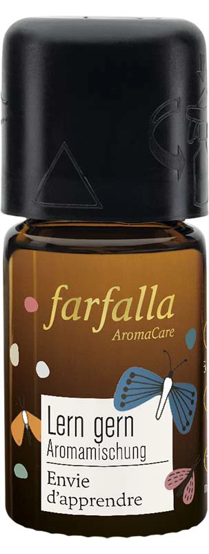 Die Aromakids, Lern gern Aromamischung, 5 ml von Farfalla unterstützt Kinder, denen es schwerfällt, ruhig zu sitzen und sich auf eine Aufgabe zu konzentrieren. Die aufmunternden ätherischen Öle von Zitrusfrüchten, Weisstanne helfen eine positive Lernatmosphäre im Raum zu schaffen. Diese Duftmischung unterstützt nicht nur die Lernfreude, sondern hilft den Kindern auch sich zu fokussieren und zu konzentrieren. Ob bei Hausaufgaben, Prüfungen oder anderen Kopfarbeiten diese Duftmischung von Farfalla ist vielseitig einsetzbar. Die Duftmischung kann in einer Duftlampe oder einem Aromavernebler angewendet werden oder auch im Riechstift für unterwegs und als Begleiter in der Schule.