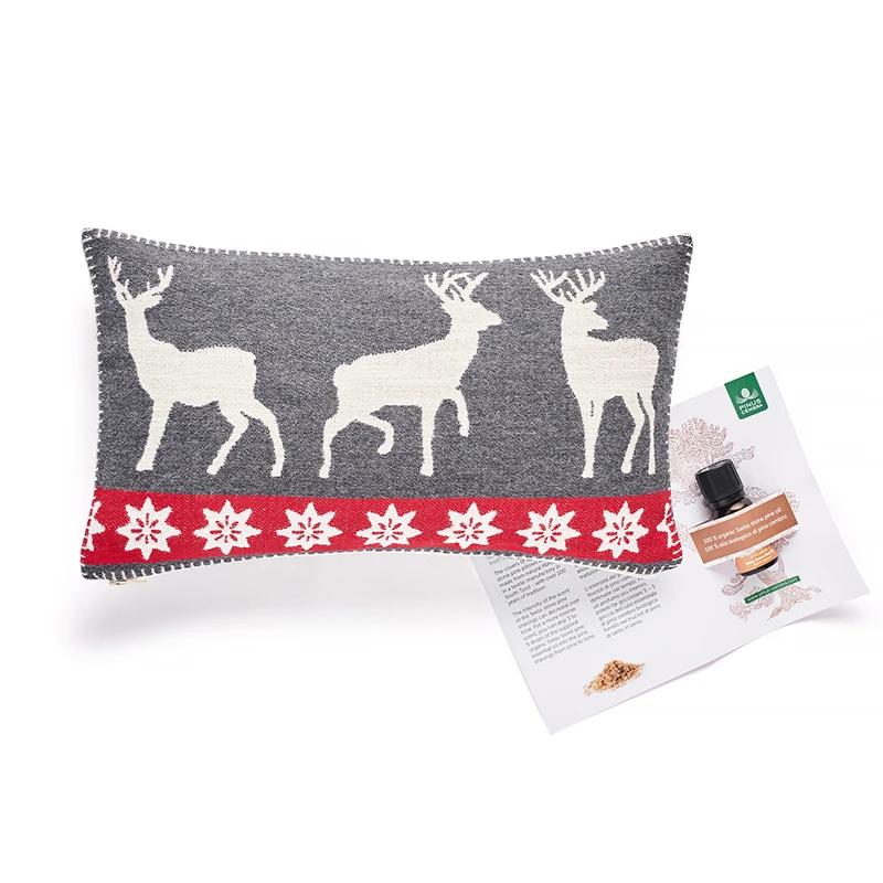 Der Kissenbezugist mit weissen Hirschen und einem roten Streifen verziert, hat einen Reissverschluss und wird in einer Südtiroler Textilmanufaktur hergestellt.