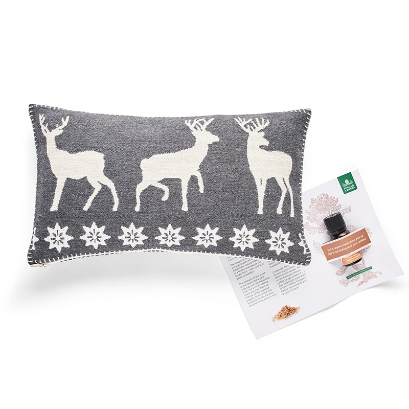 Der Kissenbezug ist mit weissen Hirschen verziert, hat einen Reissverschluss und wird in einer Südtiroler Textilmanufaktur hergestellt.