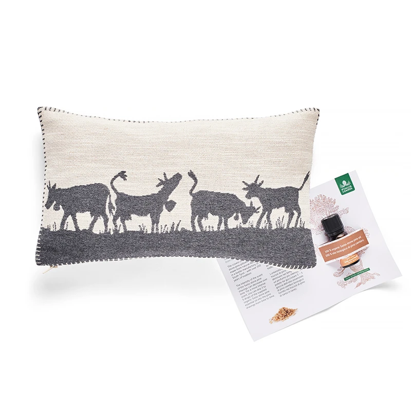 Der Kissenbezug ist mit Kühen verziert, hat einen Reissverschluss und wird in einer Südtiroler Textilmanufaktur hergestellt.