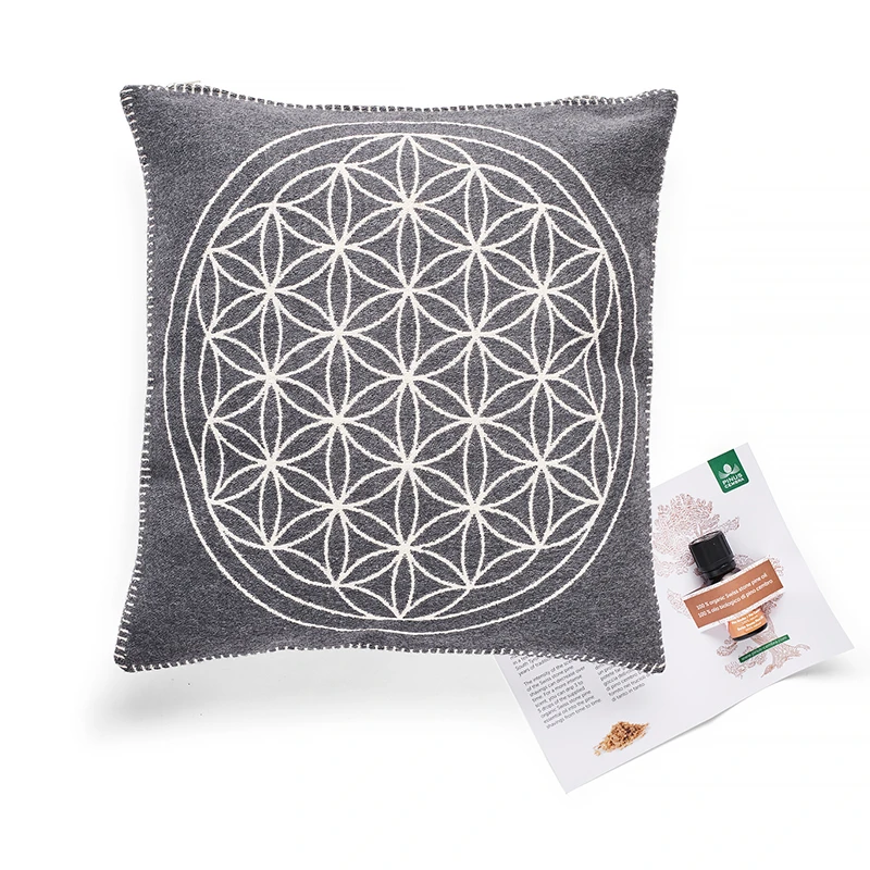Der Kissenbezug aus Baumwolle ist mit der Blume des Lebens verziert und hat einen Reissverschluss und wird in einer Südtiroler Textilmanufaktur hergestellt.
