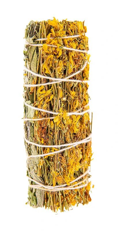 Ideales Bündel zum Ausräuchern von Wohnungen oder Häusern. Beifuss und Salbei sind traditionelle Ausräucherpflanzen. Sie haben die Kraft, negative Energien zu neutralisieren. Sie verscheuchen dunkle Energiefelder und klären die Atmosphäre. Beide legen zusätzlich einen schützenden Mantel über die Umgebung. Johanniskraut bringt dann als Lichtbringerpflanze wieder Helligkeit und Leichtigkeit in die Räume.