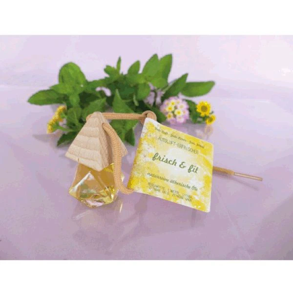 Diese formschönen Duftspender verbreiten in Ihrem Auto eine natürlich frische Atmosphäre. Über die Oberfläche des Holz-Verschlusses kann sich der Duft optimal verteilen. Er neutralisiert Gerüche. Einfach das Fläschchen für kurze Zeit auf den Kopf stellen, so dass das ätherische Öl in das Holz zieht. Mit Schnur zum Aufhängen und 8 ml ätherischem Öl Befüllt ausschließlich mit 100 % naturreinen ätherischen Ölen. Anwendung: den Holzkopf abschrauben und den Innenverschluss entfernen. Holzkopf dann wieder fest aufschrauben und den Flakon an den Rückspiegel hängen. Mit der Holzperle kann die Länge der Aufhängung beliebig verstellt werden. Vor der Fahrt kurz schütteln oder auf den Kopf stellen, damit die Holzkappe etwas Öl ansaugen kann. Der Flakon darf nicht liegen oder extrem lang gewendet werden, da eventuell austretende Tropfen Oberlfäche beschädigen könnten. Der Verschluss muss immer gut verschraubt sein. Ist der Flaon leer, kann dieser nachgefüllt werden. Bitte beachten Sie, dass der Flakon bei mehrmaligem Nachfüllen eventuell an Dichtheit und Saugfähigkeit verliert. Ätherische Öle gehören nicht in Kinderhände. frisch & fit (Bergamotte, Limette u.a.)