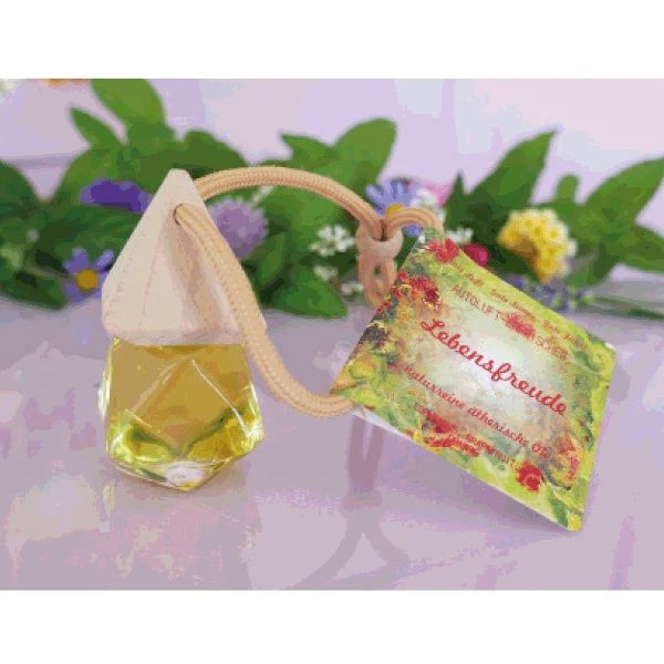Anwendung: den Holzkopf abschrauben und den Innenverschluss entfernen. Holzkopf dann wieder fest aufschrauben und den Flakon an den Rückspiegel hängen. Mit der Holzperle kann die Länge der Aufhängung beliebig verstellt werden. Vor der Fahrt kurz schütteln oder auf den Kopf stellen, damit die Holzkappe etwas Öl ansaugen kann. Der Flakon darf nicht liegen oder extrem lang gewendet werden, da eventuell austretende Tropfen Oberlfäche beschädigen könnten. Der Verschluss muss immer gut verschraubt sein. Ist der Flakon leer, kann dieser nachgefüllt werden. Bitte beachten Sie, dass der Flakon bei mehrmaligem Nachfüllen eventuell an Dichtheit und Saugfähigkeit verliert. Ätherische Öle gehören nicht in Kinderhände. Lebensfreude (Edeltanne + Zitrus)