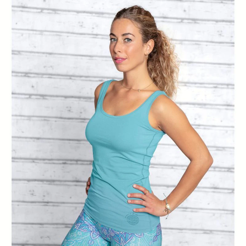 Das Damen Top ist das ganze Jahr bestens zum Unterziehen geeignet, im Sommer natürlich solo. Innen im Rückenteil, sowie auf der Hüfte ist die ‚Blume des Lebens‘ aufgedruckt mit mikrofeinem Rosenquarz in der Druckfarbe.