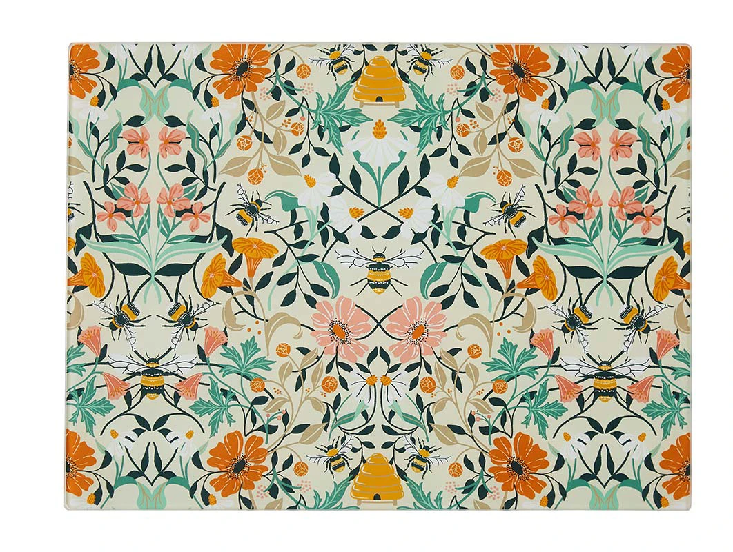 Bienen schwirren träge durch die orangefarbenen Blüten, die sich mit mintgrünen Tönen mischen, während die schwarzen Blätter im Blockdruck einen idealen Kontrast bilden. Bienenmotive sind nach wie vor ein beliebter Trend. Mit diesem schönen Arbeitsplattenschutz aus der Bee Bloom-Kollektion von Ulster Weavers liegen Sie voll im Trend.