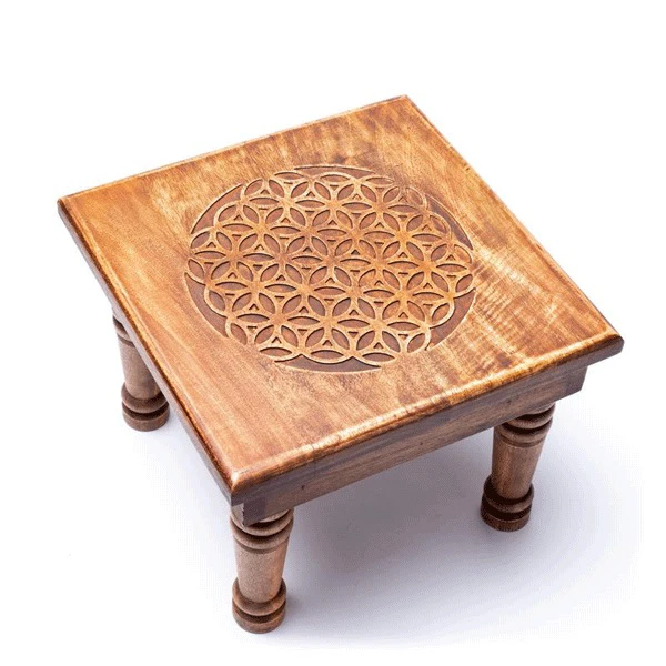 Der Beistelltisch Blume des Lebens aus Mangoholz ist mit einer hochwertigen, detailreichen Schnitzerei des Symbols der Blume des Lebens verziert. Das Holz wurde mit einer Wachspolitur poliert. Die Montage dank der Schraubbeine ganz einfach.