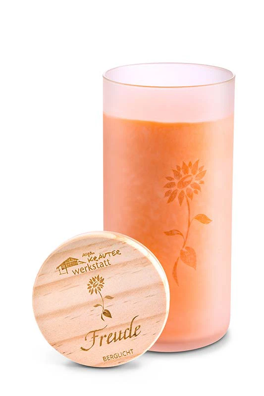 Die Berglicht-Kerze Freude im Glas wird in einer kleinen Manufaktur in den Allgäuer Alpen mit viel Sorgfalt