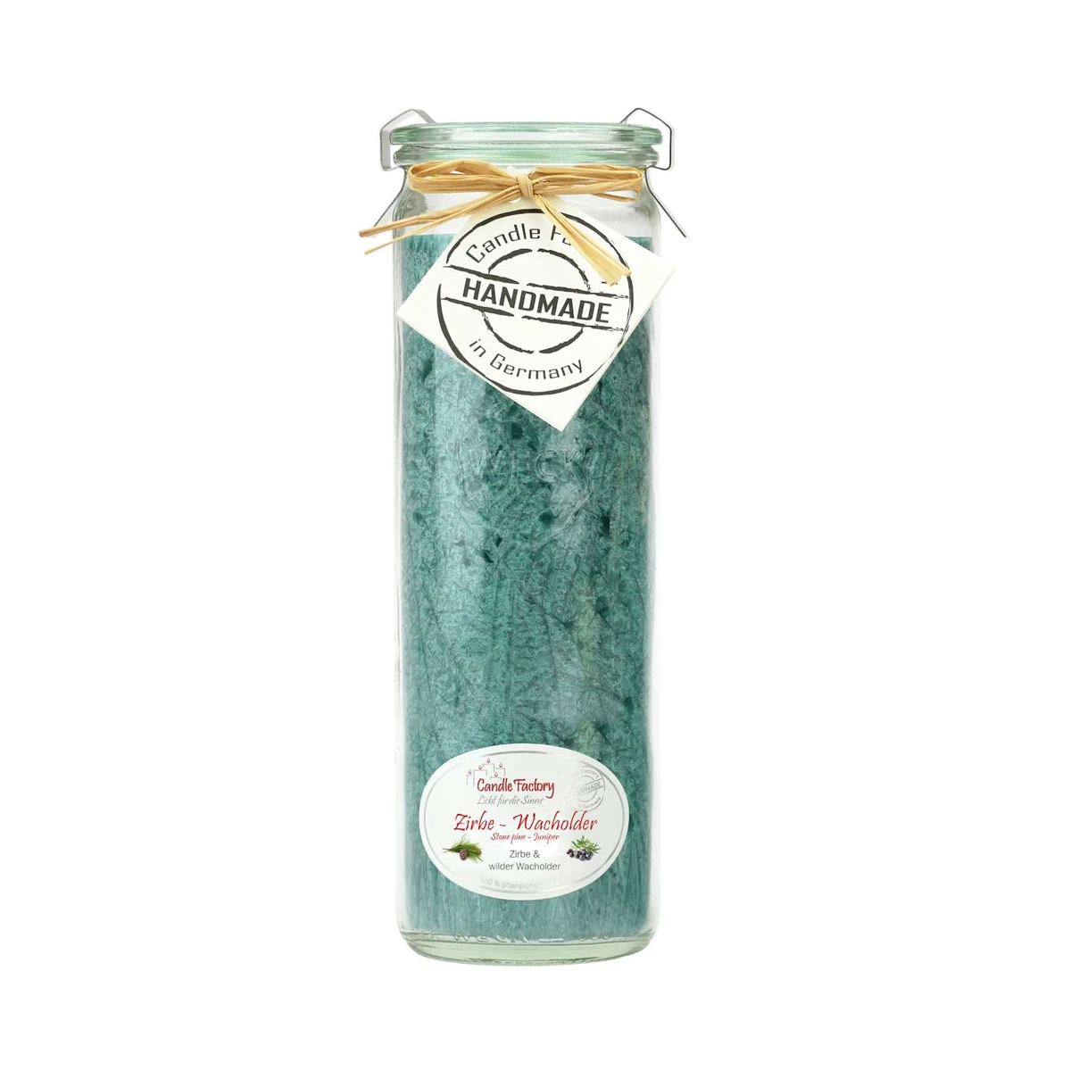 Die Big-Jumbo Zirbe-Wacholder Duftkerze Sommerwald der Candle Factory in türkis hat eine Brenndauer von ca. 100 Stunden. Die Kerze wurde von Hand in ein wiederverschliessbares Weck-Glas gegossen. Der waldige Duft von Zirbe und Wacholder erinnert an einen Waldspaziergang im Sommer. Die Kerze eignet sich hervorragend für die Terrasse, den Balkon an einem lauen Sommerabend oder auch für in die gemütliche Stube als Deko.