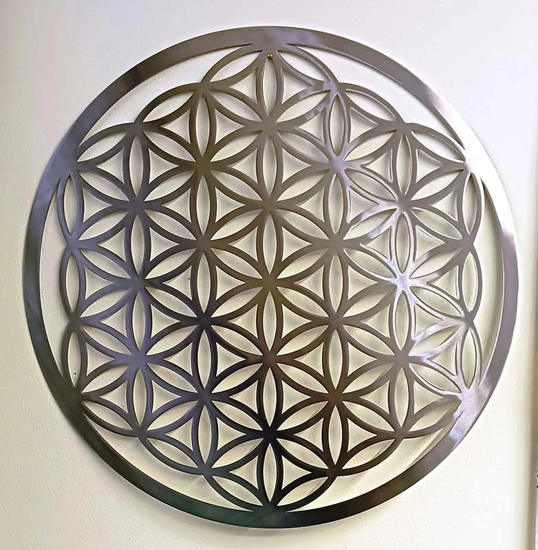 Aus der Kollektion Edelstahl Raumschmuck von Saraswati-Design. Erleben Sie die zeitlose Faszination der Blume des Lebens in unserem kunstvoll gefertigten Edelstahl-Design. Die klaren Linien und präzisen Details dieser spirituellen Symmetrie machen dieses Kunstwerk zu einem harmonischen Blickfang in jedem Raum. Hergestellt aus hochwertigem Edelstahl strahlt die Blume des Lebens eine schlichte Eleganz aus und verleiht jedem Ambiente eine inspirierende Aura. Das sorgfältig gestaltete Edelstahl-Motiv vereint Schönheit und Symbolik, und wird so zu einem bedeutungsvollen und ästhetisch ansprechenden Dekorationsstück für Ihr Zuhause.