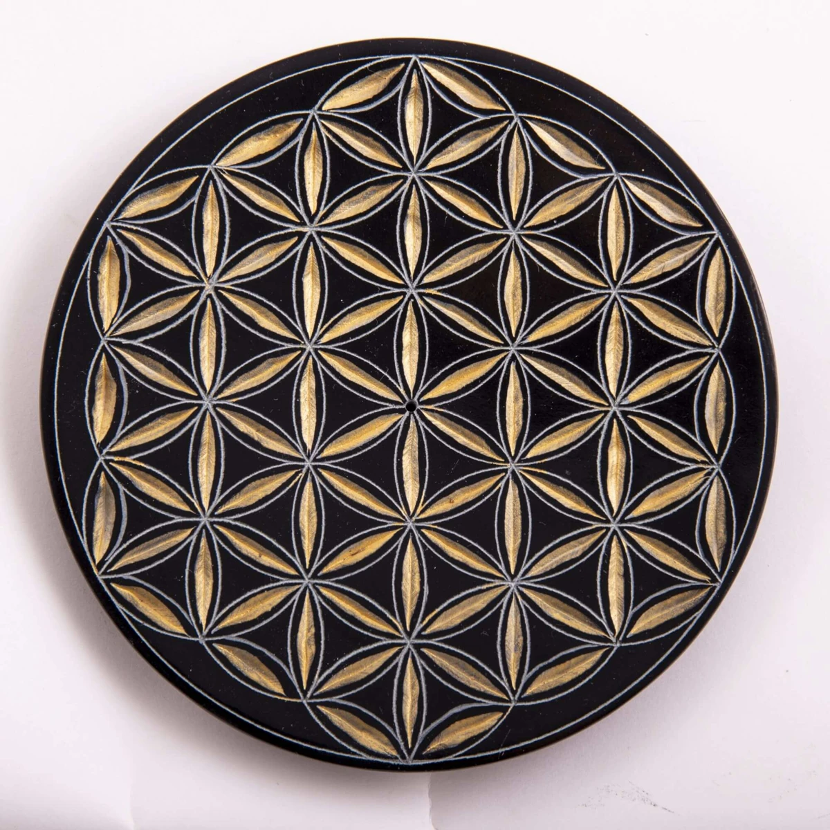 Der Blume des Lebens Räucherstäbchenhalter aus Speckstein ist ein eleganter, runder Stäbchenhalter mit einer von Hand gravierter goldener Lebensblume. Der Räucherstäbchenhalter eignet sich für die meisten gängigen Räucherstäbchen.