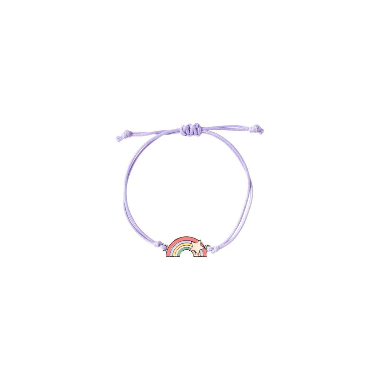Somewhere over the rainbow... Brighten up your day with this cute, pastel coloured rainbow with a peach star detail on a lilac band. The band is adjustable and will fit both kids and adults. Also available as a necklace and set of rings.