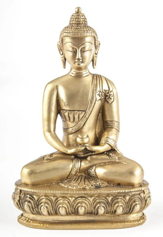 Amitabha gehört zu den am meisten verehrten Buddha-Gestalten und heisst übersetzt: „der von unermesslichem Glanz"-. Er hält die Hände im Schoss übereinandergelegt in der Meditationsgeste. Oft wird er auch mit einem Almosentopf in seinen Händen abgebildet. Die Haltung des Amitabha steht für die zukünftige Entwicklung des erleuchteten Geistes.