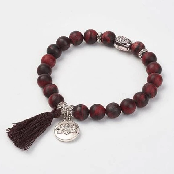 Das ausdrucksstarke Porträt Buddhas, inmitten von roten Tigerauge-Perlen – so lässt sich für jeden Tag ein Zeichen setzen. Buddha steht für Mitgefühl und vollkommene Harmonie. Immer. Die Qualität des roten Tigerauges schenkt Mut, Schutz und Sicherheit, was wir in diesen Zeiten ganz besonders gut gebrauchen können. Jedes Armband ist zudem mit einem hübschen Lotus-Charm und einer kleinen Quaste versehen. Es ist auf elastischem Band und dadurch dehnbar.