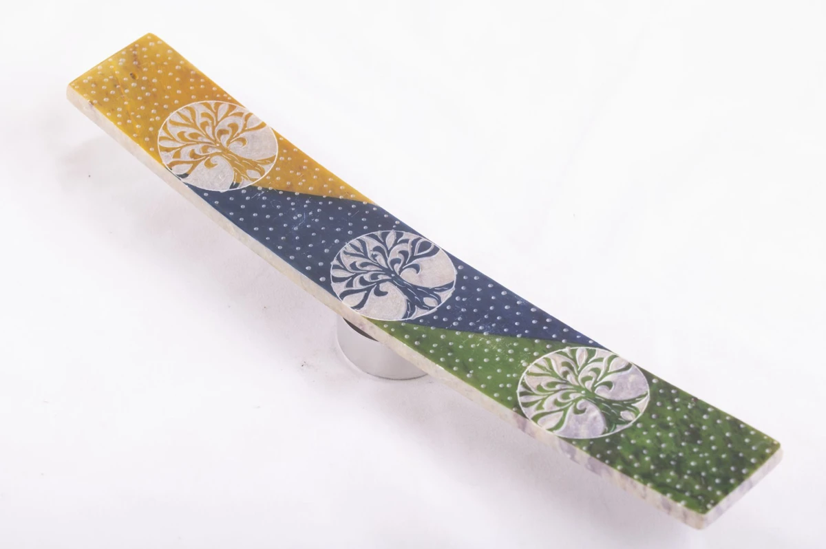 Der Bunter Lebensbaum - Räucherstäbchenhalter aus Speckstein ist ein farbenfroher Stäbchenhalter. Die Lebensbäume wurden von Hand in den Speckstein geschnitzt. Die lange Schiffchenform sorgt dafür, dass die Asche aufgefangen wird.