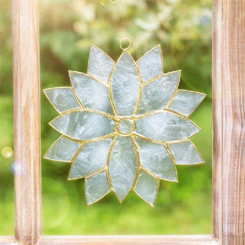 Tauchen Sie in die sanfte Magie des Fensterhängers aus natürlicher Capiz-Muschel, geformt als Lotus mit 16 Blütenblättern, ein. Im Fenster aufgehängt, fängt er das Sonnenlicht ein und verbreitet es sanft im Raum. So entsteht eine subtile, erbauliche Atmosphäre.