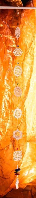 Der Chakra Suncatcher ist ca. 63 cm lang und vereint die 7 Chakras mit den farblich dazugehörenden Glaskristallen zu einem funkelndem Lichtspiel. Hängen Sie den Chakra Suncatcher vor ein Fenster und lassen Sie die Chakras Ihre Energie im Raum verteilen. Wenn das Sonnenlicht auf die Kristalle trifft, werfe sie bunte Lichtpunkte in den Raum.