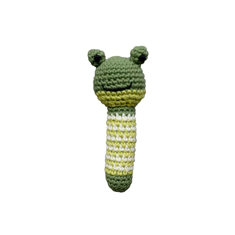 Cute handmade crochet frog rattle, a nice babygift. Comes with a cotton giftbag.