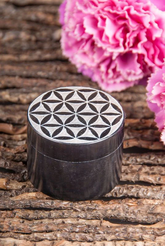 Süsses kleines Specksteindöschen mit einer handgravierter Lebensblume zum Aufbewahren vieler wichtiger und kleiner Dinge. Speckstein, ø 5 cm, H: 3,5 cm