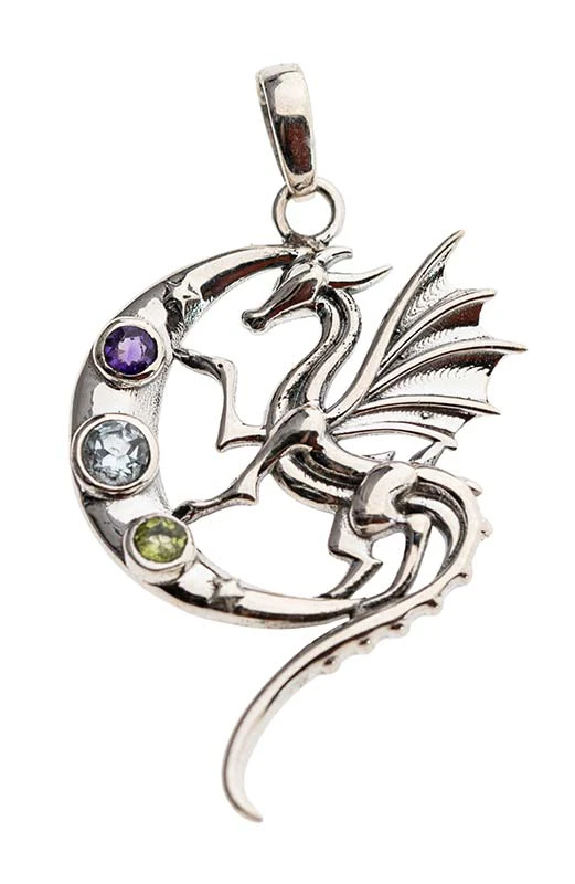 In der heutigen Zeit des Wandels und der Transformation in höhere Ebenen führt uns der Drache mit Kraft und Weisheit in spirituelle Höhen. Dabei wird er von drei Erdenergien unterstützt: Amethyst steht für spirituelle Erleuchtung, blauer Topaz stärkt Weisheit und Integrität und Peridot öffnet das Herzchakra für magische Welten.