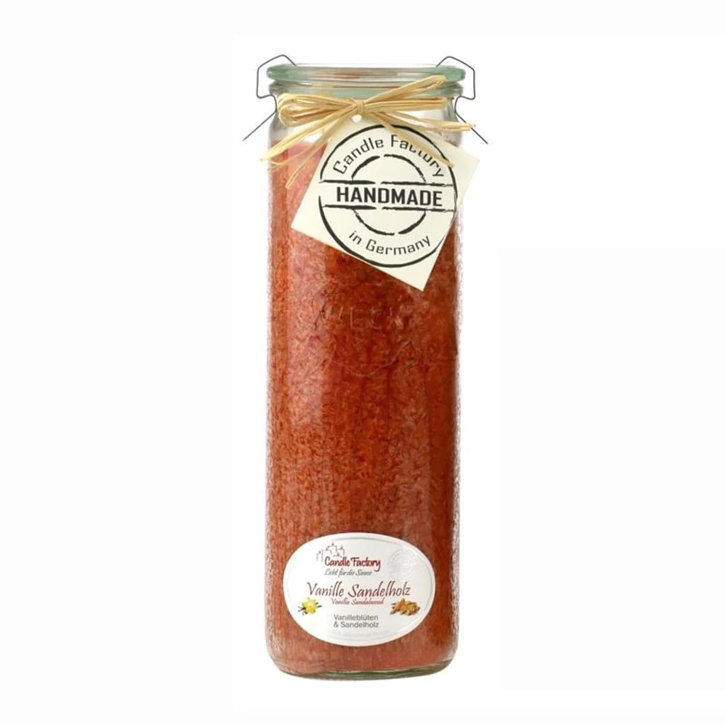 Die Duftkerze Vanille-Sandelholz der Candle Factory in terracotta hat einen weichen Duft nach Vanille und Sandelholz, der an stimmungsvolle Zeiten erinnert. Die Kerze wurde von Hand in ein wiederverschliessbares Weck-Glas gegossen und hat eine Brenndauer von bis zu 100 Stunden.