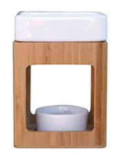 Schlichte Teelicht-Duftlampe zur Verdunstung ätherischer Öle in die Raumluft. Aus Bambus mit weißer Keramikschale, 9 x 9 cm, 14 cm hoch.