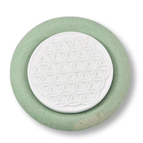 Material: Gips, Ton. Masse: Duftstein Ø 5,5 cm,Unterteller zartgrün Ø 8 cm.