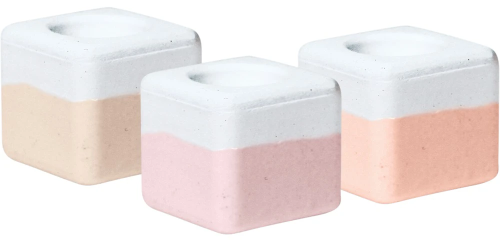 Jedem Duft ein eigener Duftstein! Mit den kecken Kuben ist immer der passende Stein für einen Duftimpuls zu Hand. Für die punktuelle Raum-, Auto- oder Schrankbeduftung. Oben ist die offene Oberfläche zum Beträufeln mit ätherischen Ölen oder Duftmischungen bestimmt, die untere Hälfte ist in drei stilvollen Farbvarianten zur optischen Unterscheidung glasiert. Je 3 x 3 cm.