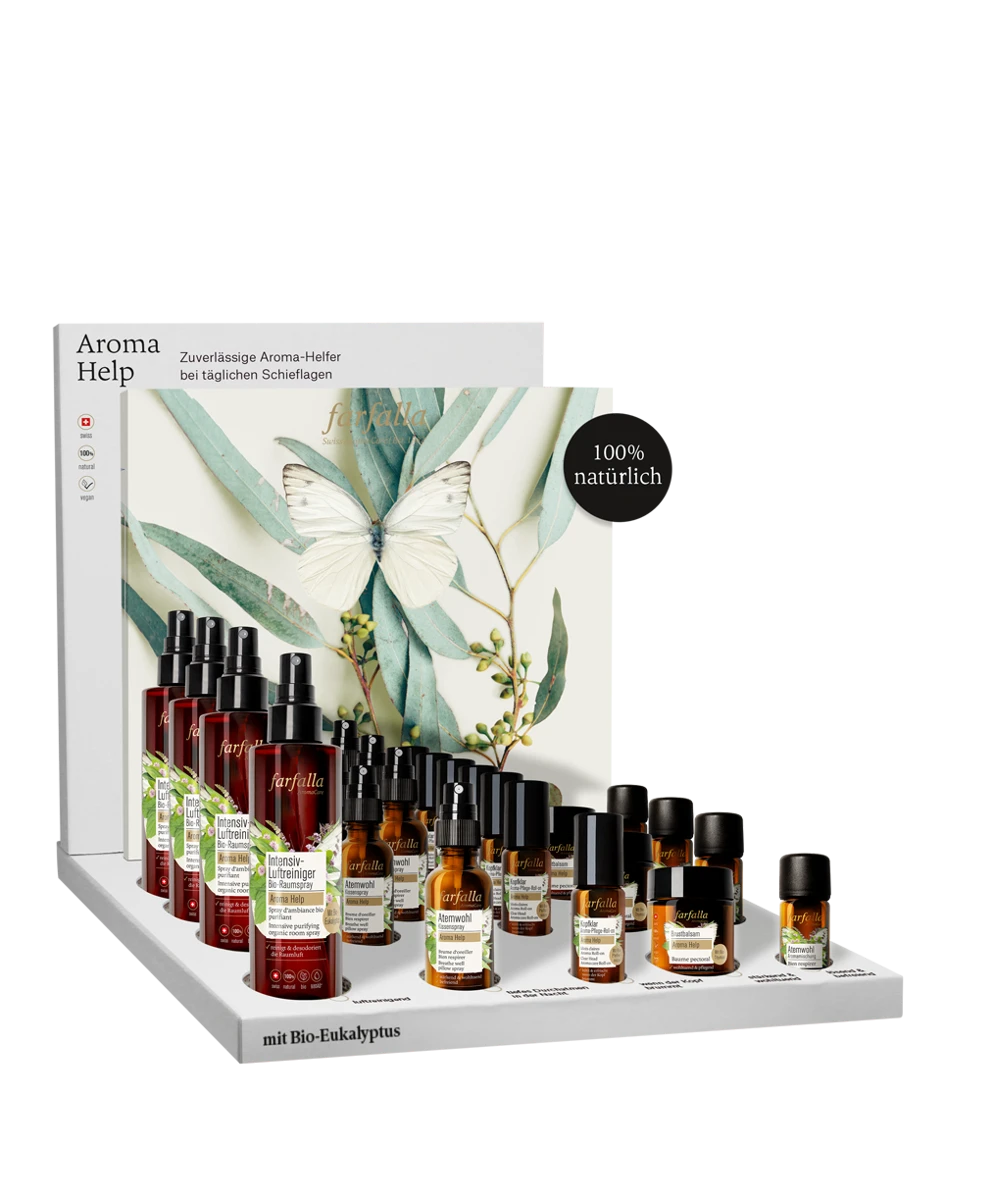 Inhalt: 3x Bio-Raumspray Intensiv-Luftreiniger + Tester / 3x Brustbalsam + Tester / 3x Aromamischung Atemwohl + Tester / 6x Aroma-Pflege-Roll-on Kopfklar + Tester / 6x Kissenspray Atemwohl + Tester / Regalstörer