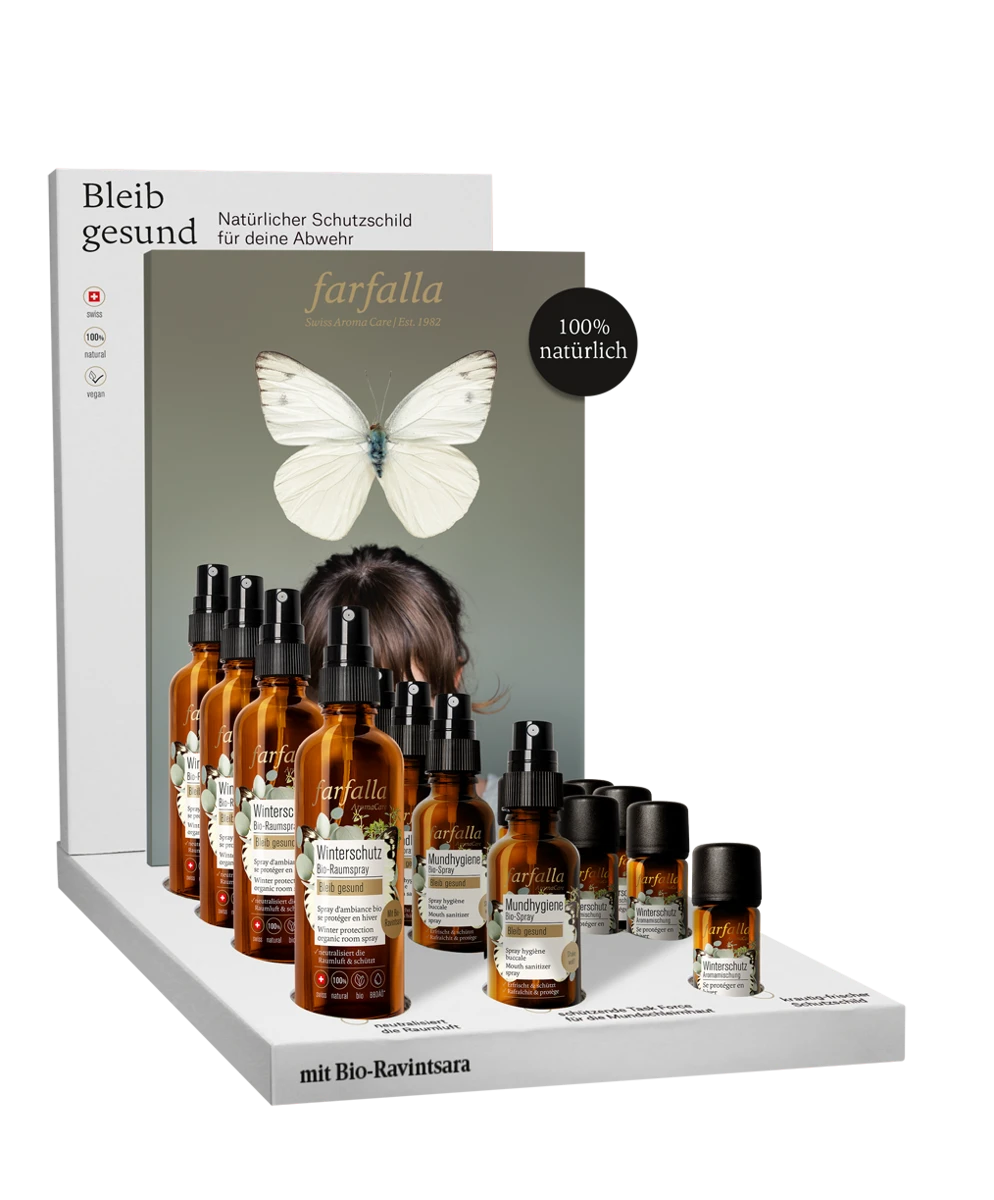 Inhalt: 3x Winterschutz Bio-Raumspray + Tester / 3x Pfefferminze Mundhygiene Spray / 6x Winterschutz Aromamischung + Tester / Regalstörer