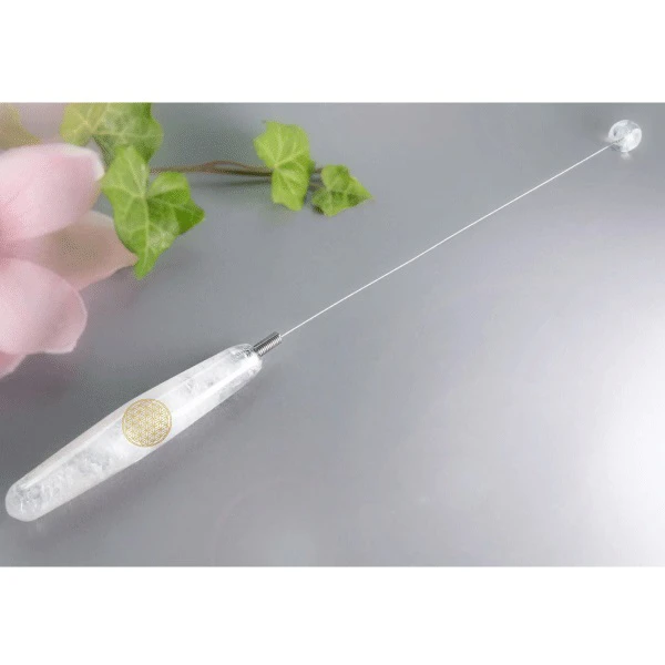 Material: Stahl mit stabiler Feder, Schwingkugel und Griff aus Bergkristall mit LEBENSBLUME-Gravur.