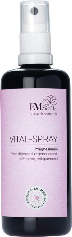 Der EMsana Vital-Spray für die Faszien-Pflege. Der Spray fördert und erhält die Beweglichkeit und Elastizität des Bindegewebes. Der Vital-Spray ist eine mineraltherapeutische Anwendung. Durch die synergetisch wirkenden Inhaltsstoffe Magnesium-Sole, EM-Meersalz-Sole, EM fermentiert und Blütenessenzen entsteht ein Allroundtalent, das Ihnen bei Haut-, Gelenk- und Bewegungsproblemen hilft. Ermöglichen Sie sich einen Neustart für mehr Wohlbefinden, Beweglichkeit, Gelenkigkeit und Lebensfreude! Versorgen Sie Ihre Haut, Ihr Bindegewebe und Ihre Gelenke auf schnellste und effektivste Art mit dem für eine schmerzfreie Bewegung unerlässlichen Magnesium. Das medizinische Spektrum, in dem positive Effekte mit MagnesiumSole bzw. mit dem Vital-Spray erzielt werden können ist gross.