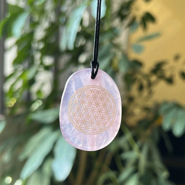 Das Energie-Amulett Blume des Lebens aus Rosenquarz hängt an einem schlichten Baumwollband. Mit diesem Amulett können Sie das kraftvolle Symbol der Blume des Lebens immer bei sich tragen. Das Energie-Amulett wurde aus reinem Rosenquarz gefertigt und auf der einen Seite ist das heilige Symbol der Blume des Lebens eingearbeitet. Der Rosenquarz ist der Stein der Liebe und des Herzens.