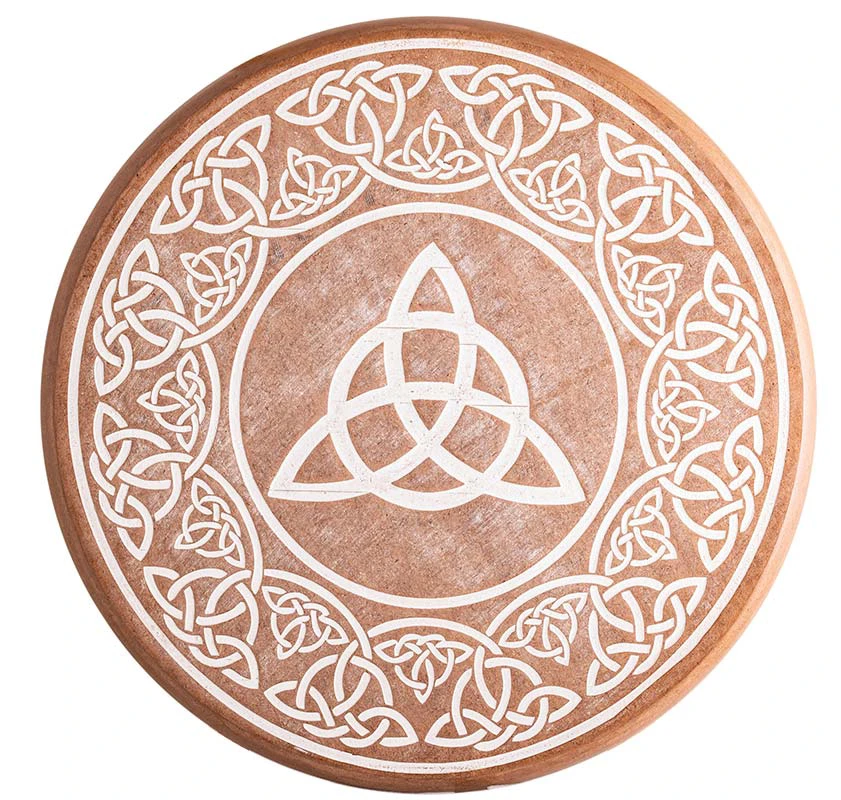 Die Triqueta ist ein uraltes Symbol für die heilige Drei. Für die Kelten symbolisierte sie das Leben, den Tod und die Wiedergeburt. Die Verflechtungen repräsentieren die Unteilbarkeit und Gleichheit der Dreieinigkeit.