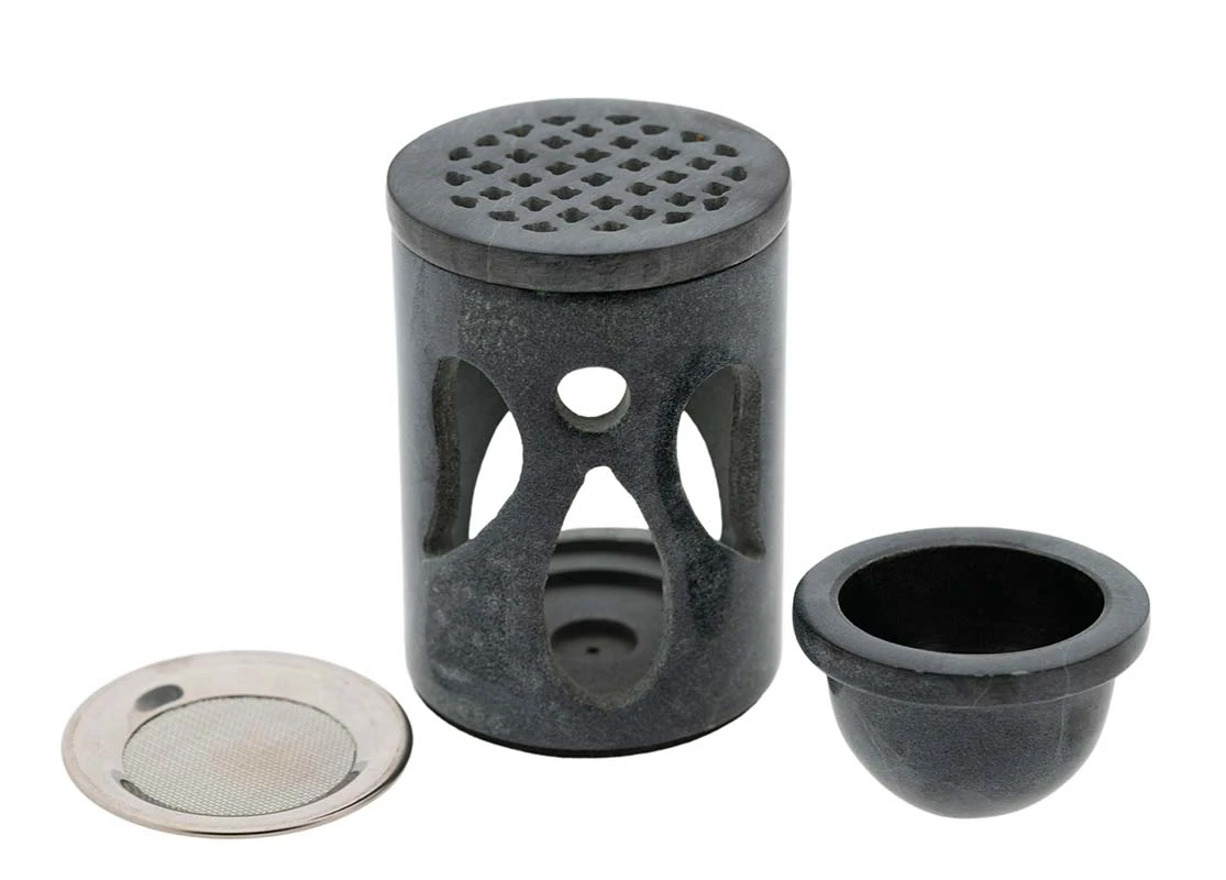 Unser Alleskönner für jede Gelegenheit. Als Kegelhalter (im Boden ist zusätzlich eine kleine Vertiefung eingearbeitet), als Siebgefäss, zum Räuchern, als Aromalampe (Specksteinschale liegt bei) oder als süsse Teelichtlampe (der obere Deckel wirft zusätzlich bezaubernde Lichtmomente in den Raum).