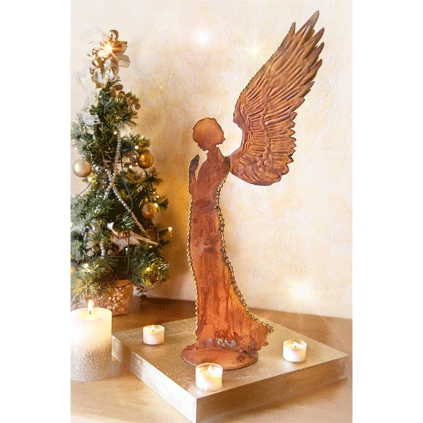 Der Engel Lelahel in Rostoptik ist ca. 53 cm hoch. Diese Engelsfigur strahlt Anmut und Schönheit aus. Die aufgerichteten Flügel sind auf der Innenseite leuchtend golden, ebenso die Umrisse der ganzen Figur. Von dem Platz, an dem er steht, geht eine wundervolle Ausstrahlung aus. Lassen Sie sich von seinem Anblick daran erinnern, sich Zeit zu nehmen für innere Einkehr und Besinnlichkeit.