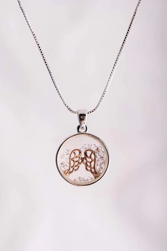 Geschützt im Inneren des Kristallbetts mit vielen kleinen Glitzersteinchen befinden sich zarte Engelsflügel. Ihr Auftrag "Wache über mich", welcher fest auf der Aussenseite des Kreises eingraviert ist.