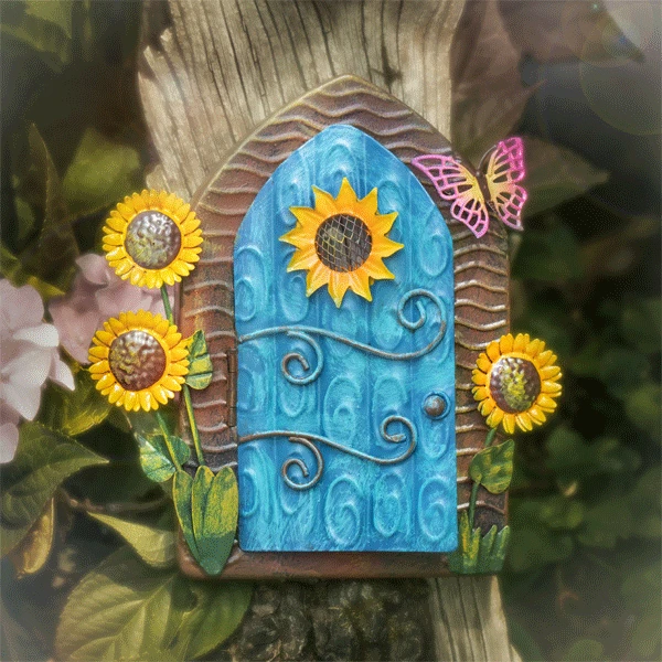 Verspielt und voller Charme lädt diese blaue Tür alle kleinen Lichtwesen ein, die auf leisen Füsschen unterwegs sind. Ein Fenster in Sonnenblumenform strahlt warmherzig nach aussen, während Sonnenblumen den Rahmen schmücken. Ein rosafarbener Schmetterling wacht liebevoll über den Eingang – bereit, zauberhafte Begegnungen willkommen zu heissen.
