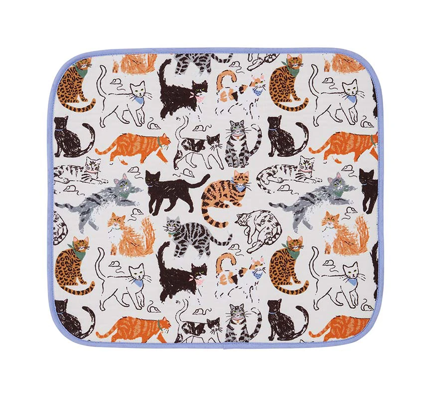 On this beautifully designed Dish Drying Mat each cat is depicted in a different style of illustration which gives a rich collage feel. Watercolour and ink cats meet expressive oil pastel kitties, while outlined mice sneak around the cats for a playful feel that brings the whole design together.