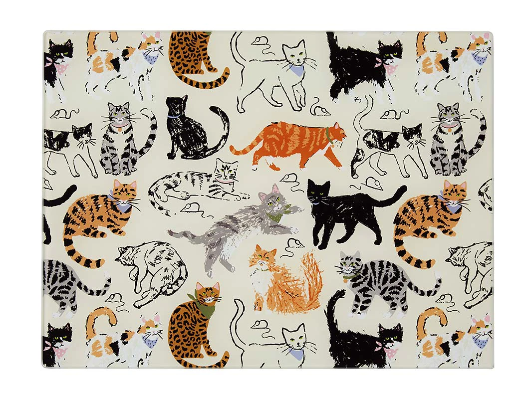 On this beautifully designed Glass Worktop Saver each cat is depicted in a different style of illustration which gives a rich collage feel. Watercolour and ink cats meet expressive oil pastel kitties, while outlined mice sneak around the cats for a playful feel that brings the whole design together.