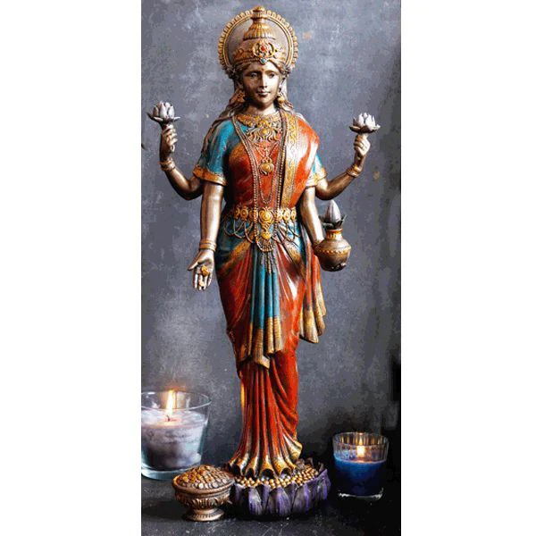 Lakshmi, die Göttin des Glücks, der Schönheit und der Liebe. Selten findet man sie so wunderbar sinnlich dargestellt. Sie hat vier Arme und Hände. In den erhobenen Händen hält sie Lotusblüten, die für Schönheit stehen. Aus ihrer rechten fallen Goldstücke, ein Symbol für Reichtum, ihre linke umfasst ein rundes Gefäß mit einer Lotusknospe.