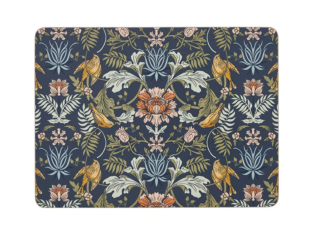 Mit diesem wunderschönen, von William Morris inspirierten, Tischset liegen Sie voll im Arts & Crafts-Trend. Finken sitzen auf den Zweigen und picken nach Beeren, während sich geschwungene Blätter träge um blühende Chrysanthemen und Glockenblumen winden. Satte dunkle Töne werden durch Moosgrün und leuchtendes Ocker ergänzt, während dunkle Rosatöne für Zartheit sorgen. Erhältlich in einer Auswahl an Designs, Mustern und Farben, die alle von den hauseigenen Designern von Ulster Weavers in Nordirland entworfen wurden.
