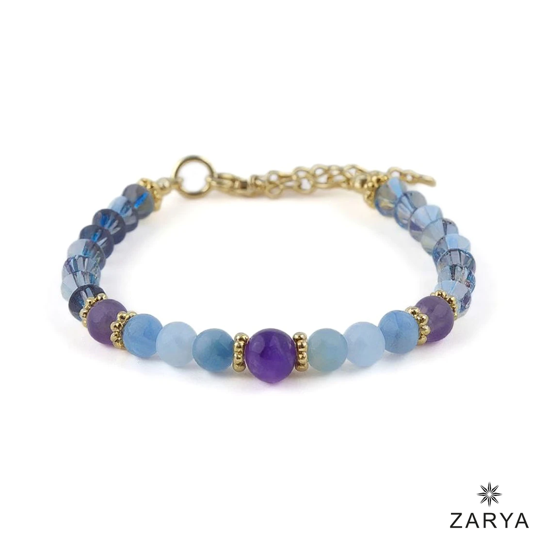 Dieses handgefertigte Edelstein-Armband, inspiriert von der träumerischen und intuitiven Energie des Sternzeichens Fische, vereint die Kraft des Amethysts mit dem facettierten Aquamarin und funkelnden Crystal Bermuda Blue Preciosa Kristallen. Feine goldene Zwischenelemente und Miyuki Rocailles Perlen setzen warme Akzente und verleihen dem Design aquatische Leichtigkeit.